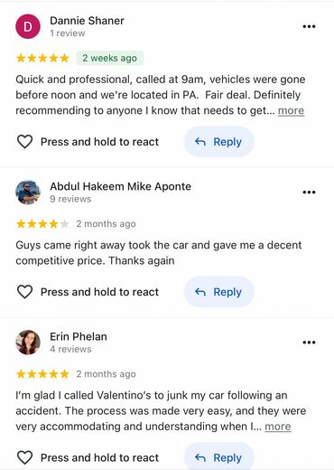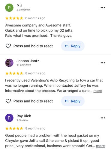 At Valentinos Auto Recycling, we buy all cars, trucks, and SUVs and offer the best prices in Mercer County. Call us today at 609-373-9412 to get started.